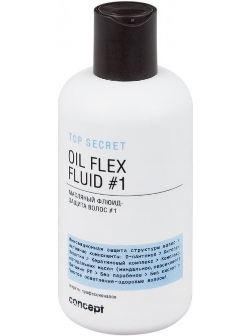 Масляный флюид-защита волос #1(OIL FLEX FLUID) Первая фаза защиты волос при обесцвечивании. Продукт добавляется в осветляющий порошок.В поисках наиболее эффективного косметического средства, способного обеспечить волосам 100% защиту во время процедуры осветления и мелирования, остановите свой выбор на профессиональном флюиде Top Secret Oil Flex Fluid #1. Косметическое средство, созданное компанией Concept, бережно заботится о структуре волос, помогая прядям сохранить здоровый внешний вид и привлекательность.